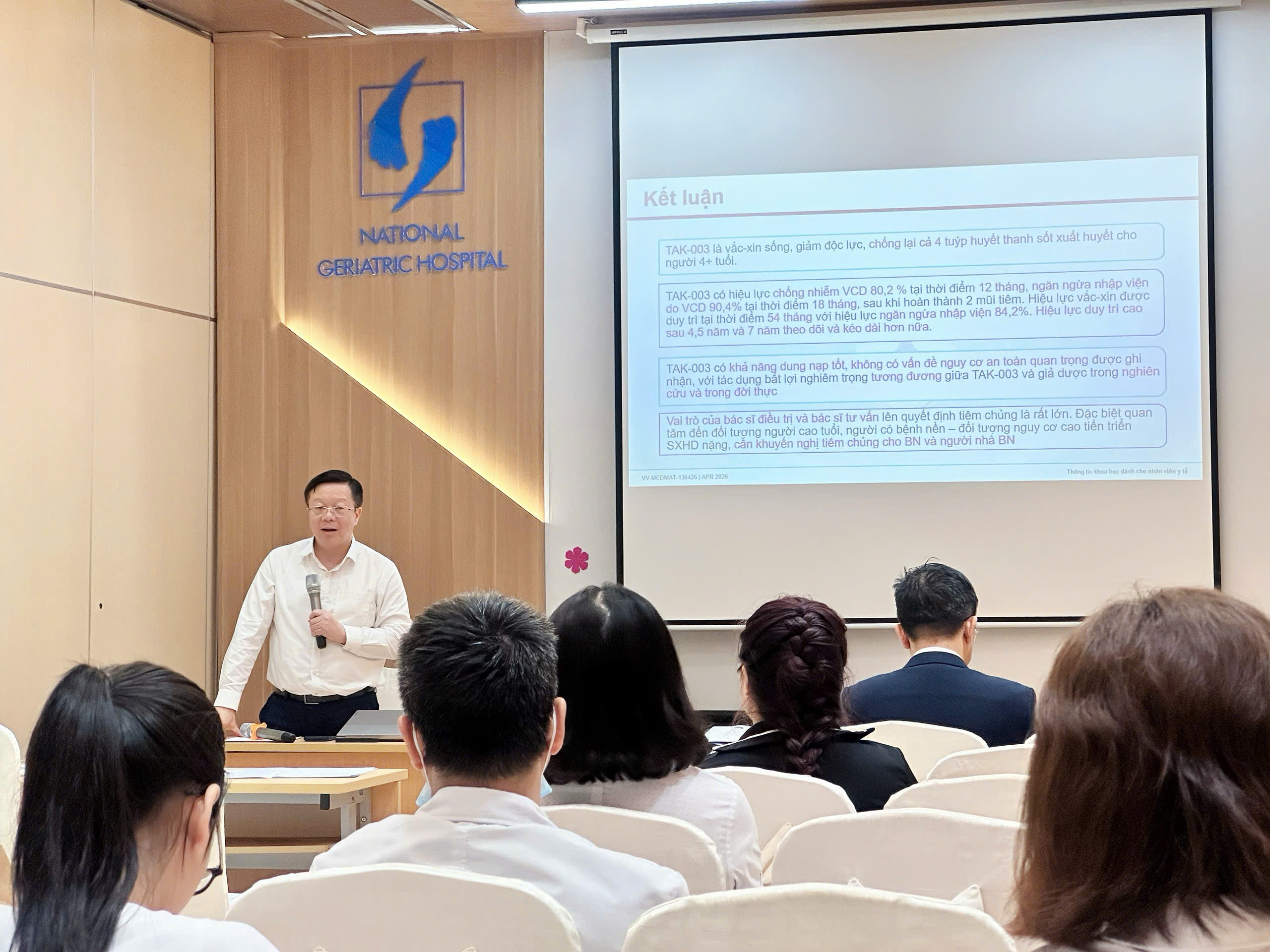 Ngày 14/4/2026, Bệnh viện Lão khoa Trung ương tổ chức buổi sinh hoạt khoa học định kỳ với hai chuyên đề: Tổng quan về sốt xuất huyết Dengue và vai trò của dự phòng chủ động ở người cao tuổi và người có bệnh lý nền; Vắc-xin sốt xuất huyết: Dữ liệu nghiên cứu và cập nhật trong thực hành.