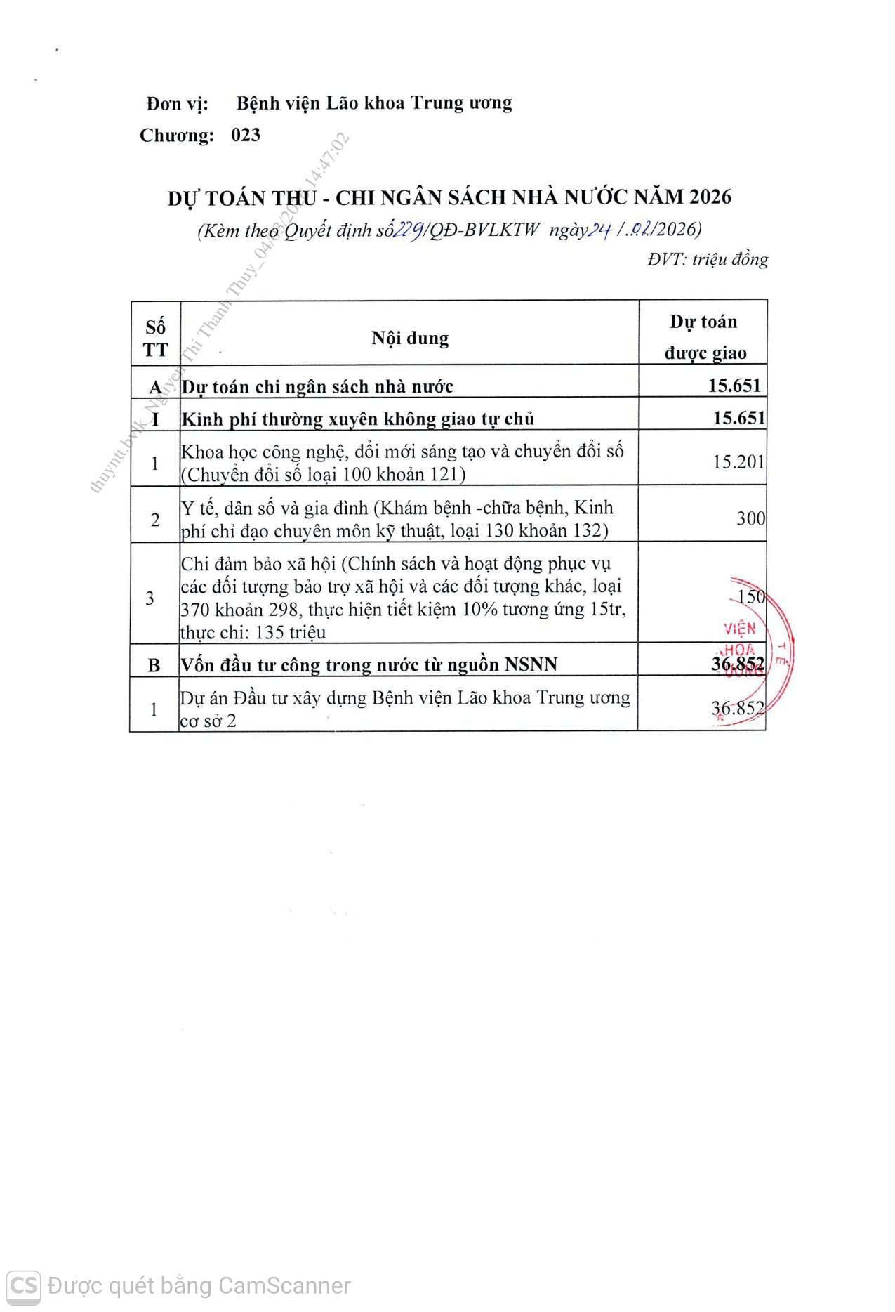 QUYẾT ĐỊNH SỐ 229/QĐ-BVLKTW VỀ VIỆC CÔNG BỐ CÔNG KHAI GIAO DỰ TOÁN NGÂN SÁCH NĂM 2026 CỦA BỆNH VIỆN LÃO KHOA TW
