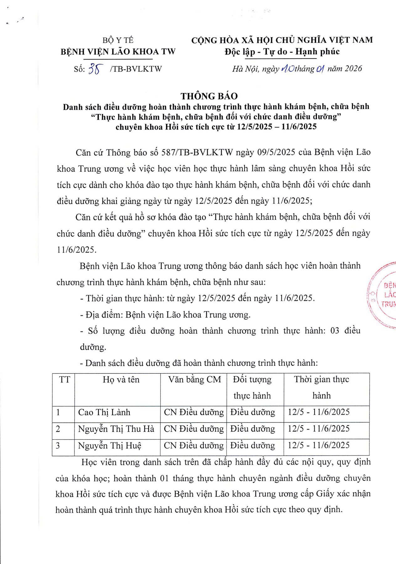 THÔNG BÁO SỐ 35/TB-BVLKTW NGÀY 10/01/2026