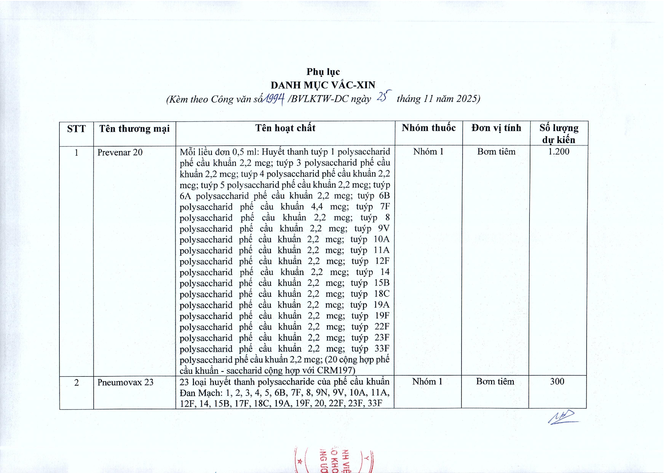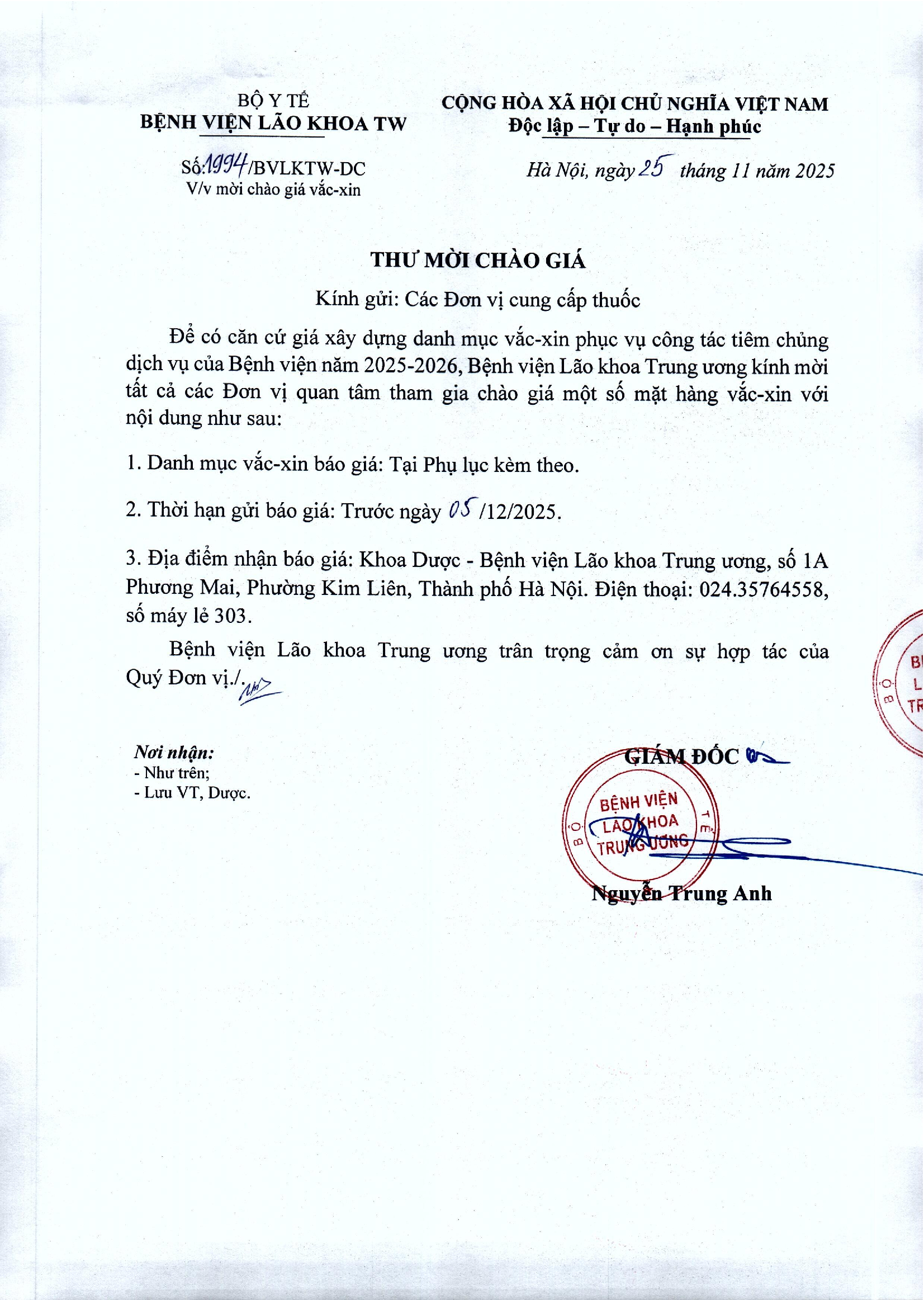 THƯ MỜI CHÀO GIÁ SỐ 1994/BVLKTW-DC NGÀY 25/11/2025