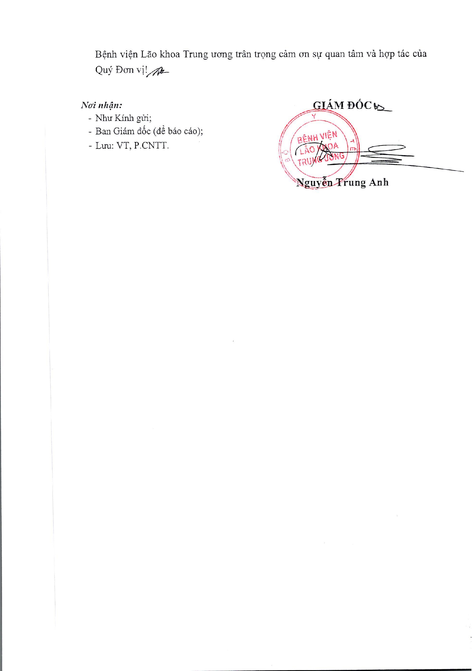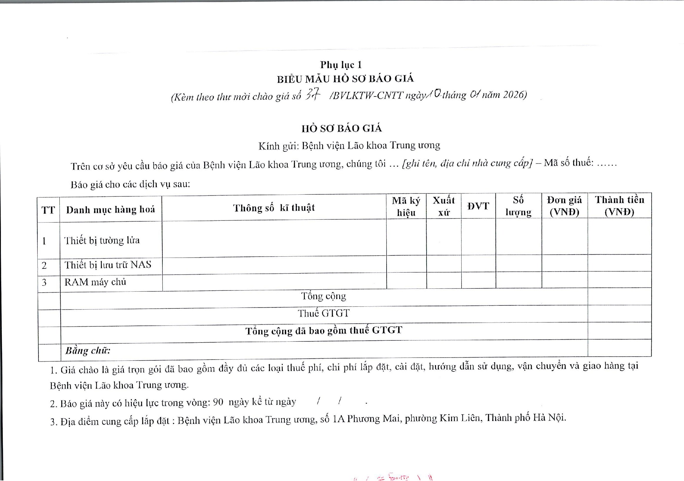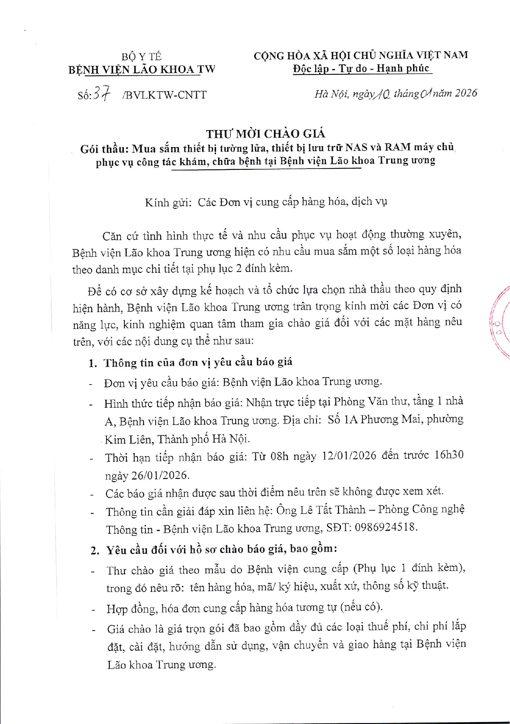 THƯ MỜI CHÀO GIÁ SỐ 37/BVLKTW-CNTT NGÀY 10 THÁNG 1 NĂM 2026