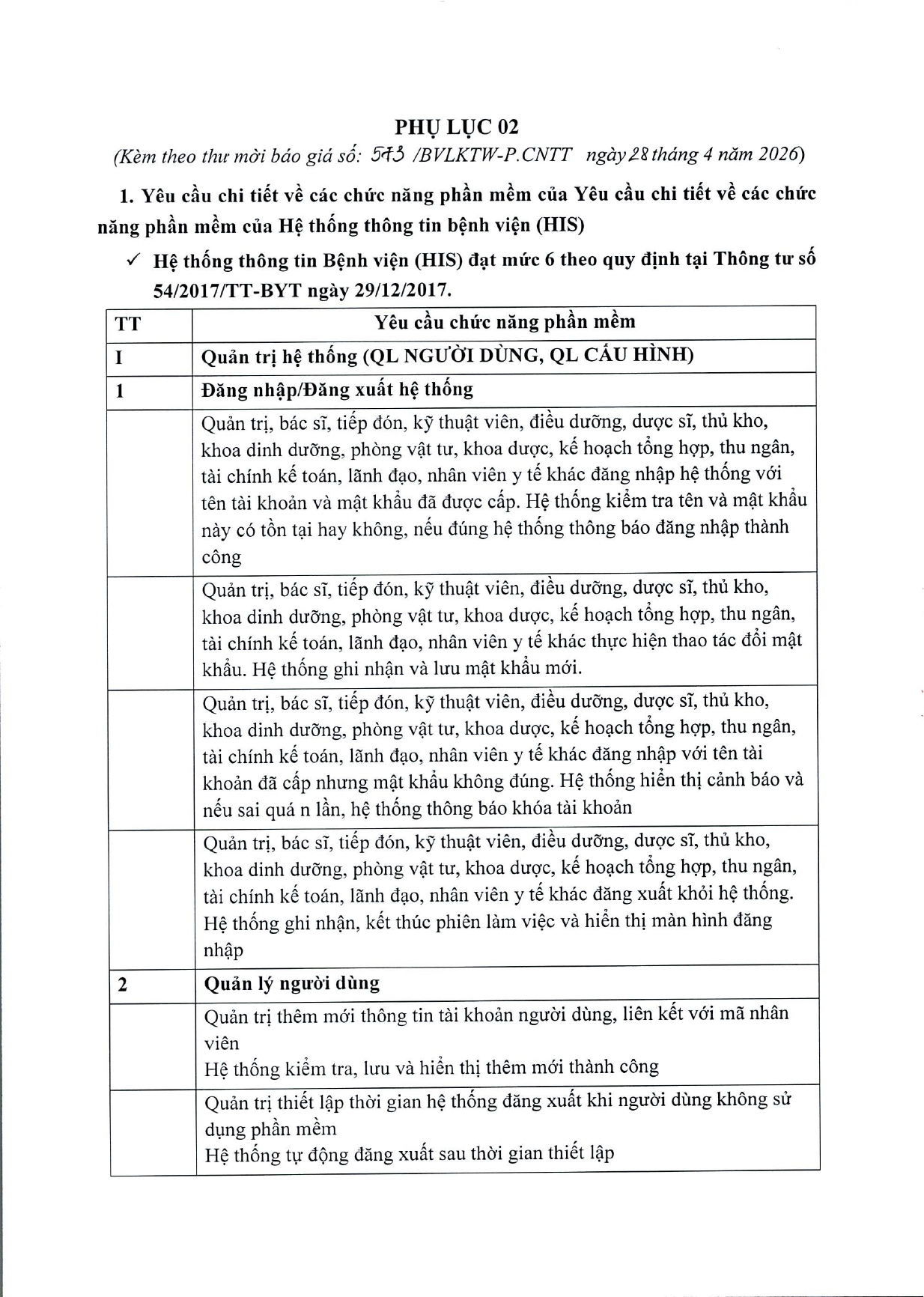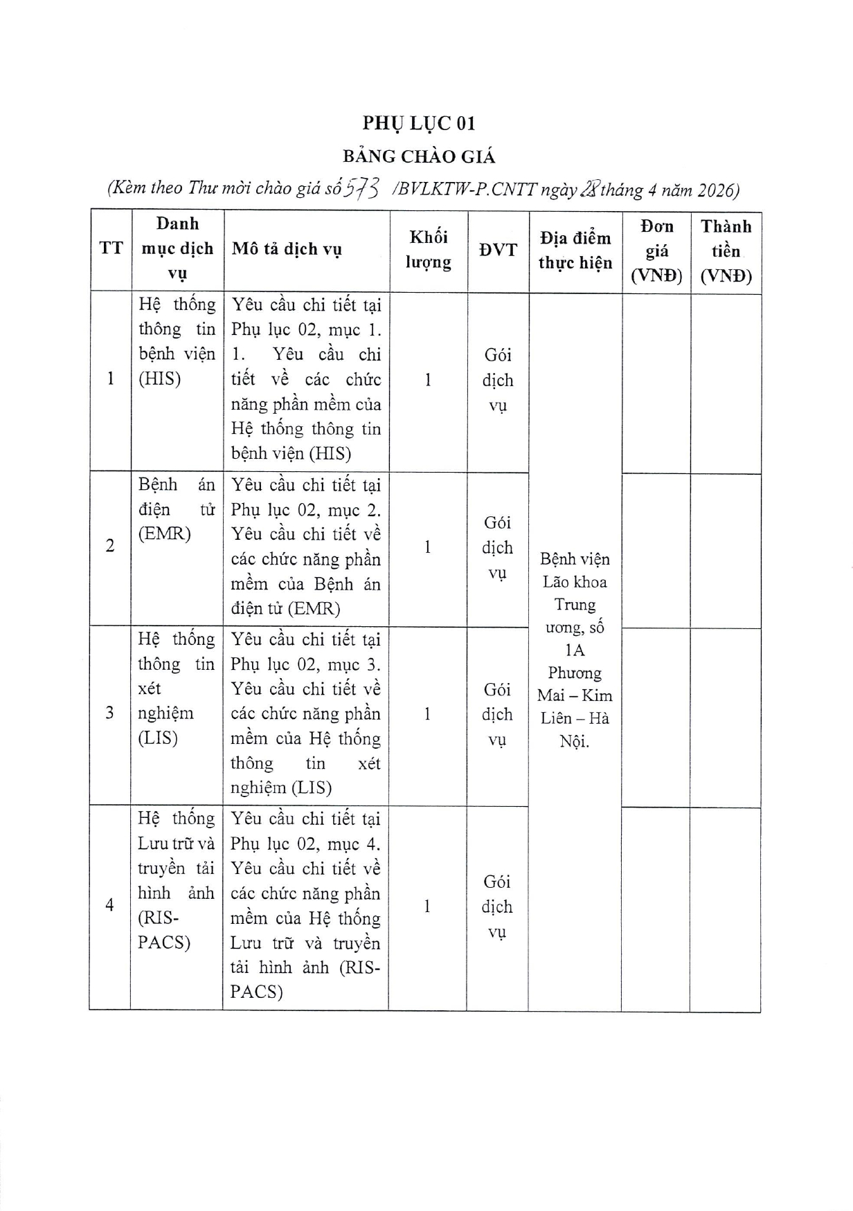 THƯ MỜI CHÀO GIÁ SỐ 573/BVLKTW-P.CNTT NGÀY 28/4/2026