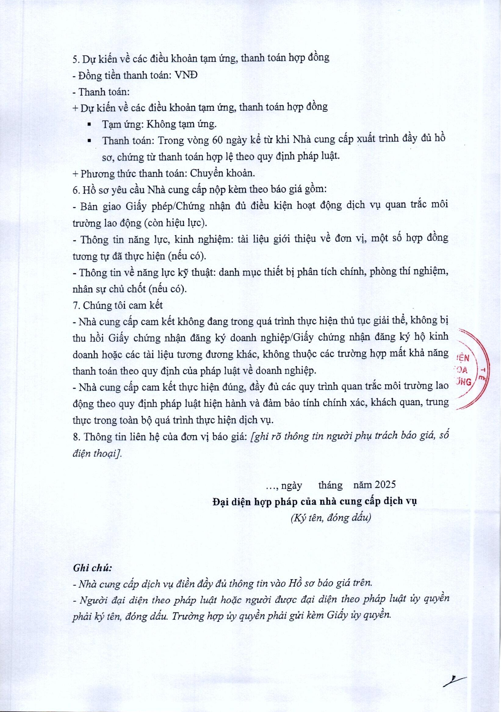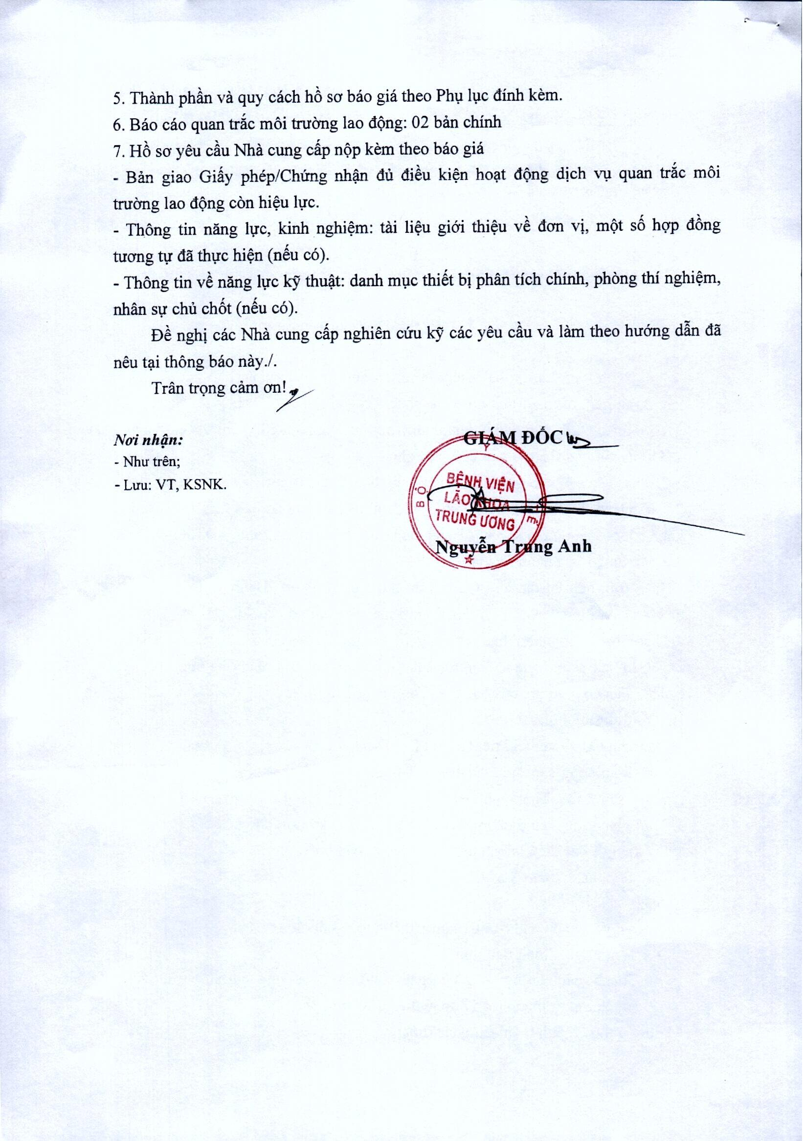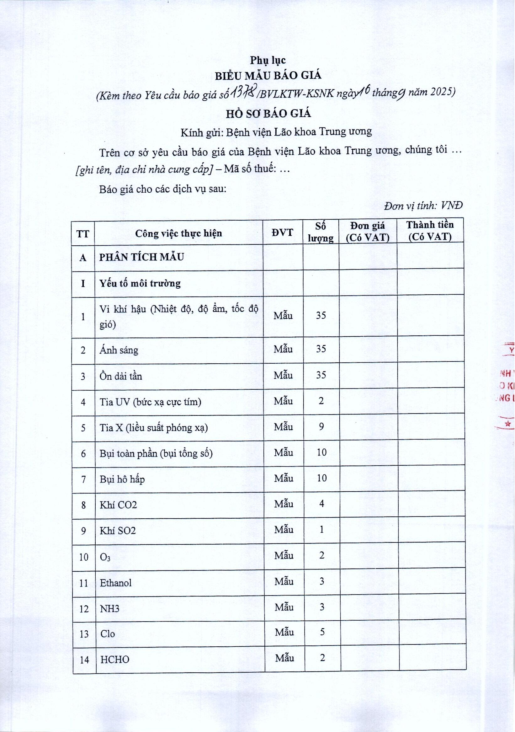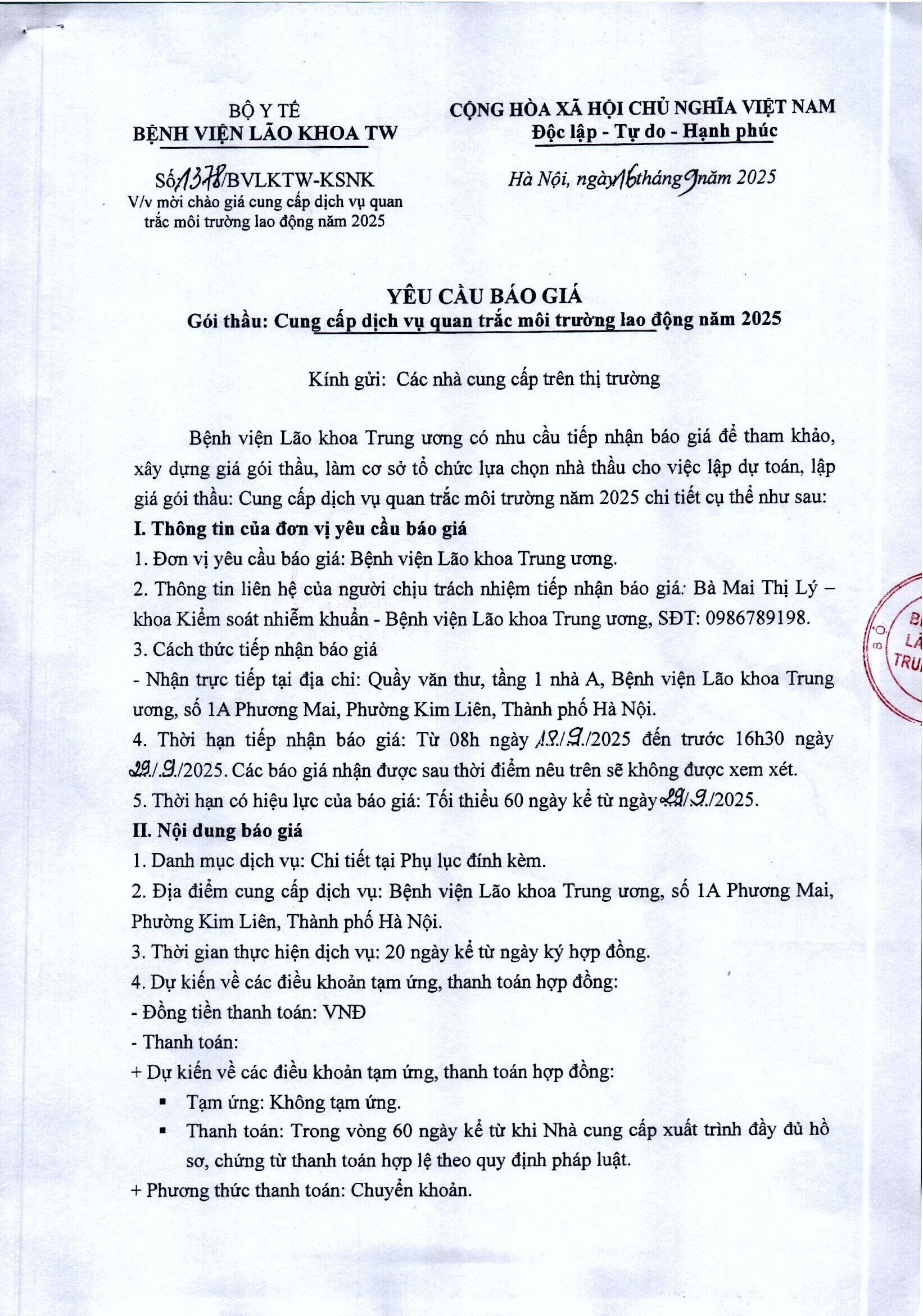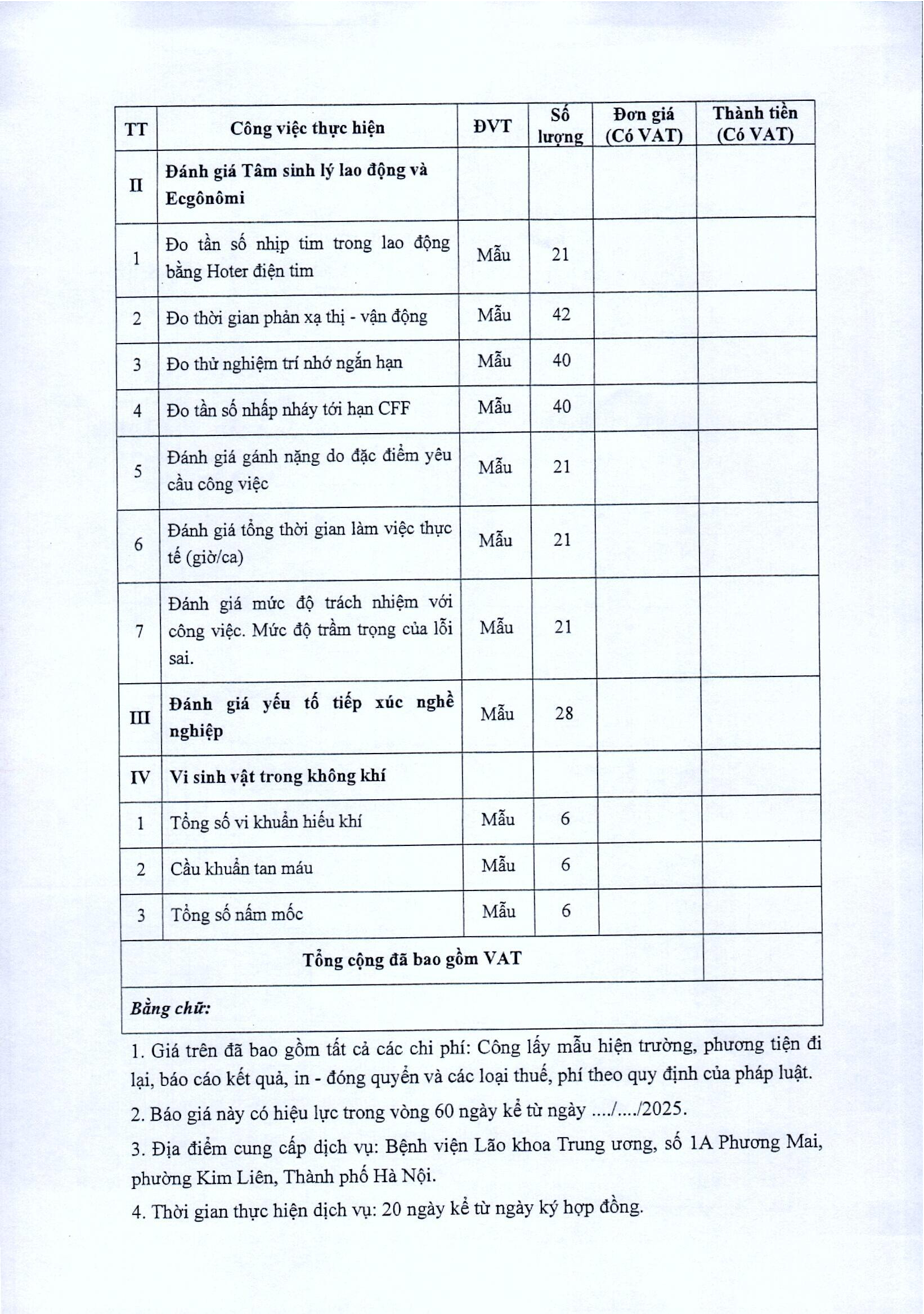 YÊU CẦU BÁO GIÁ SỐ 1378/BVLKTW-KSNK, GÓI THẦU: CUNG CẤP DỊCH VỤ QUAN TRẮC MÔI TRƯỜNG LAO ĐỘNG NĂM 2025
