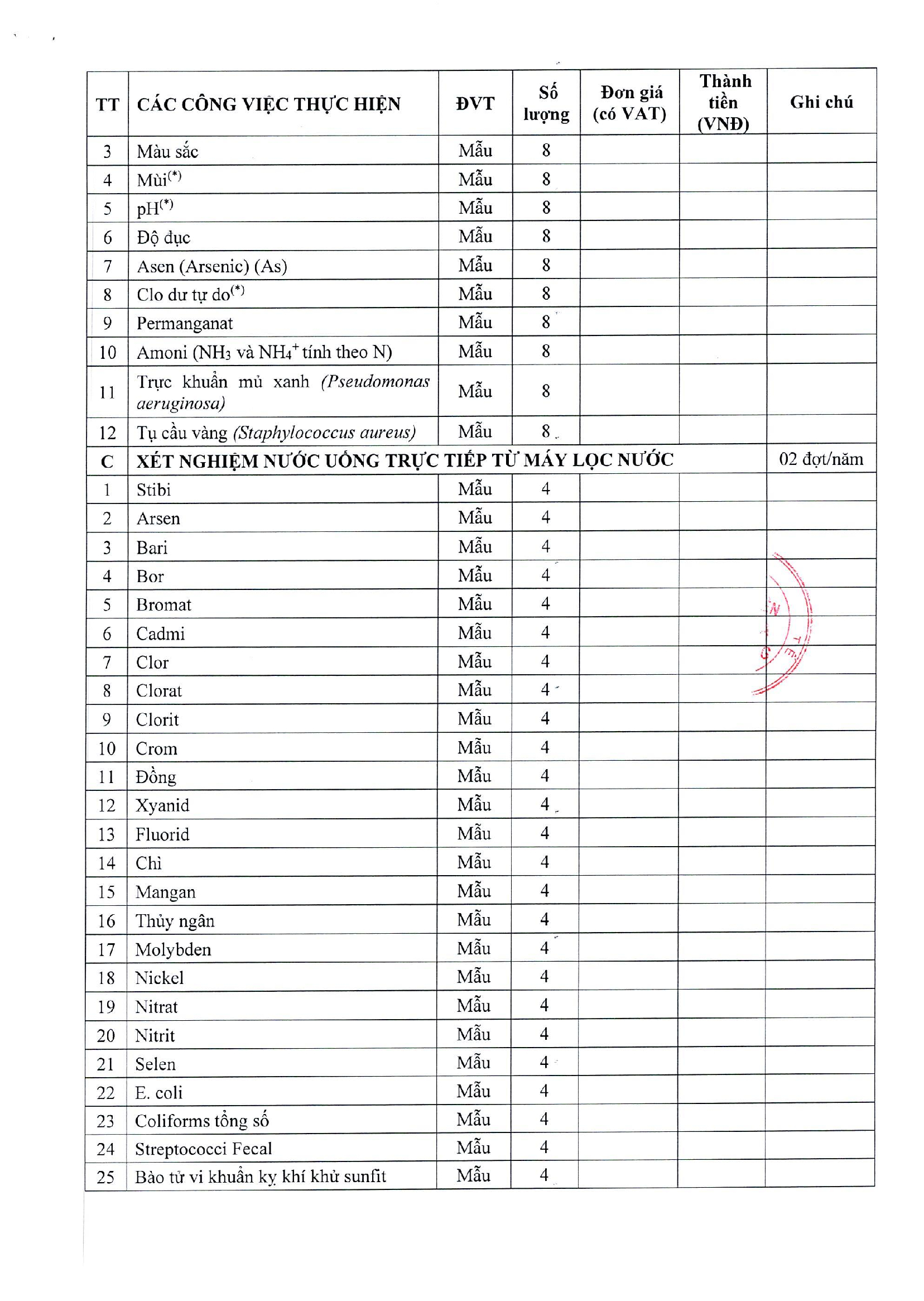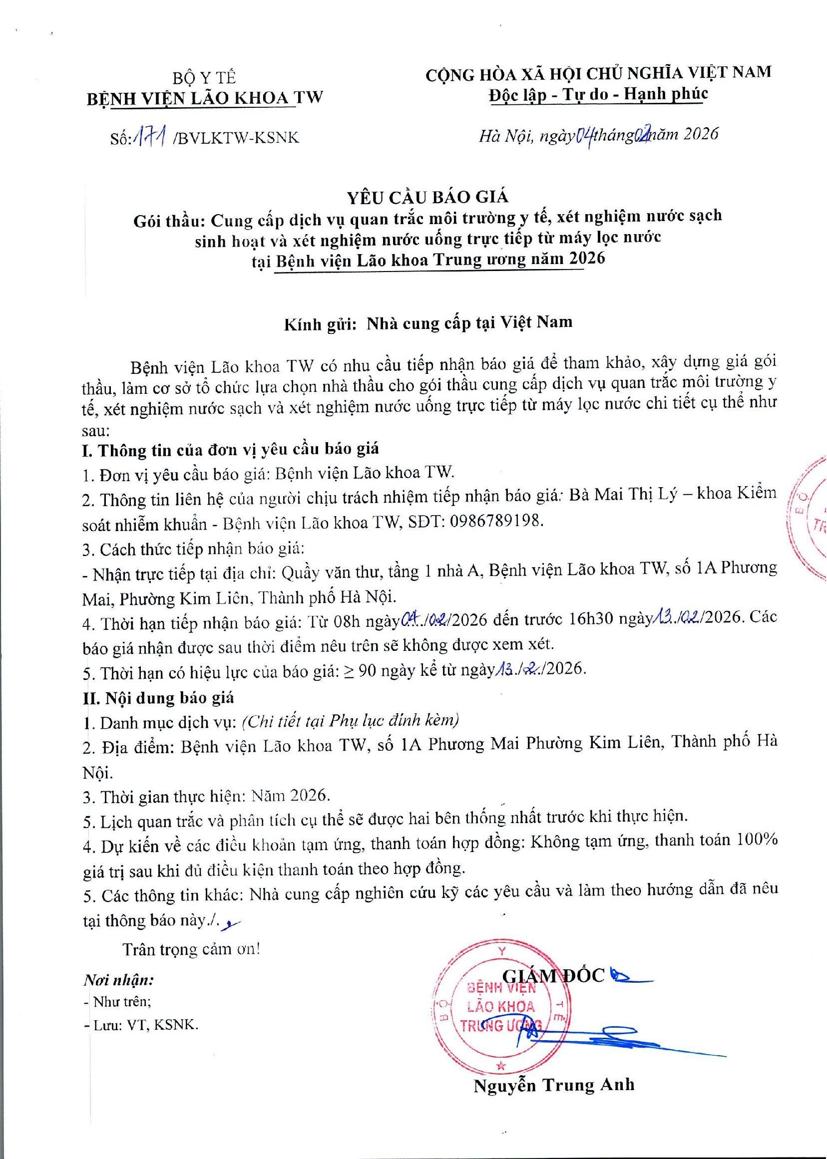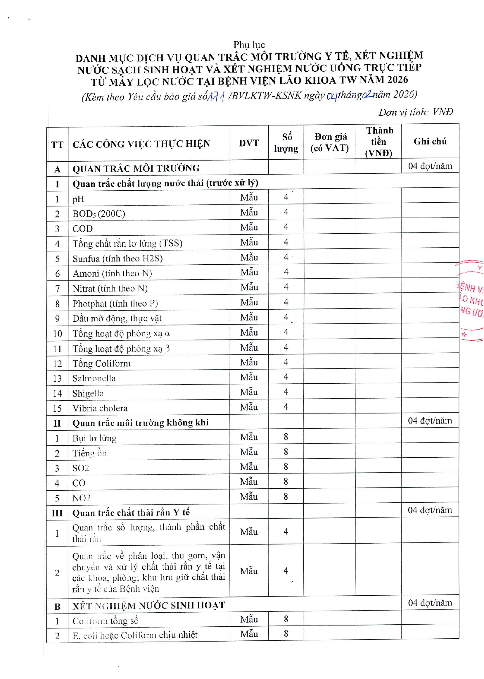 YÊU CẦU BÁO GIÁ SỐ 171/BVLKTW-KSNK GÓI THẦU: CUNG CẤP DỊCH VỤ QUAN TRẮC MÔI TRƯỜNG Y TẾ, XÉT NGHIỆM NƯỚC SẠCH SINH HOẠT VÀ XÉT NGHIỆM NƯỚC UỐNG TRỰC TIẾP